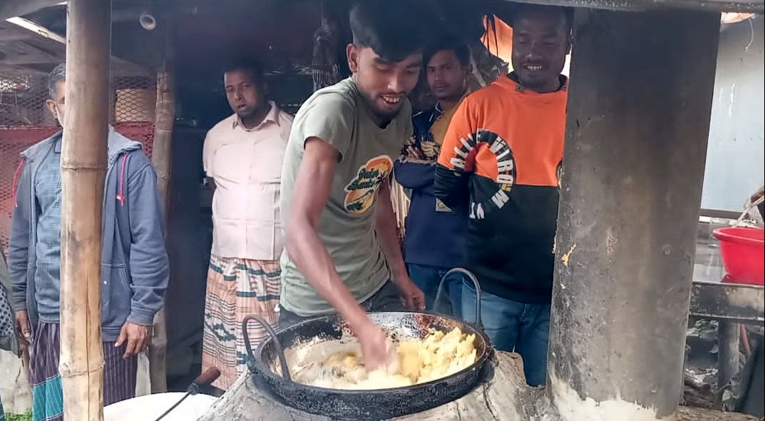 আত্রাইয়ে ফুটন্ত তেলে হাত ডুবিয়ে পেঁয়াজু ভাজছেন রাকিব