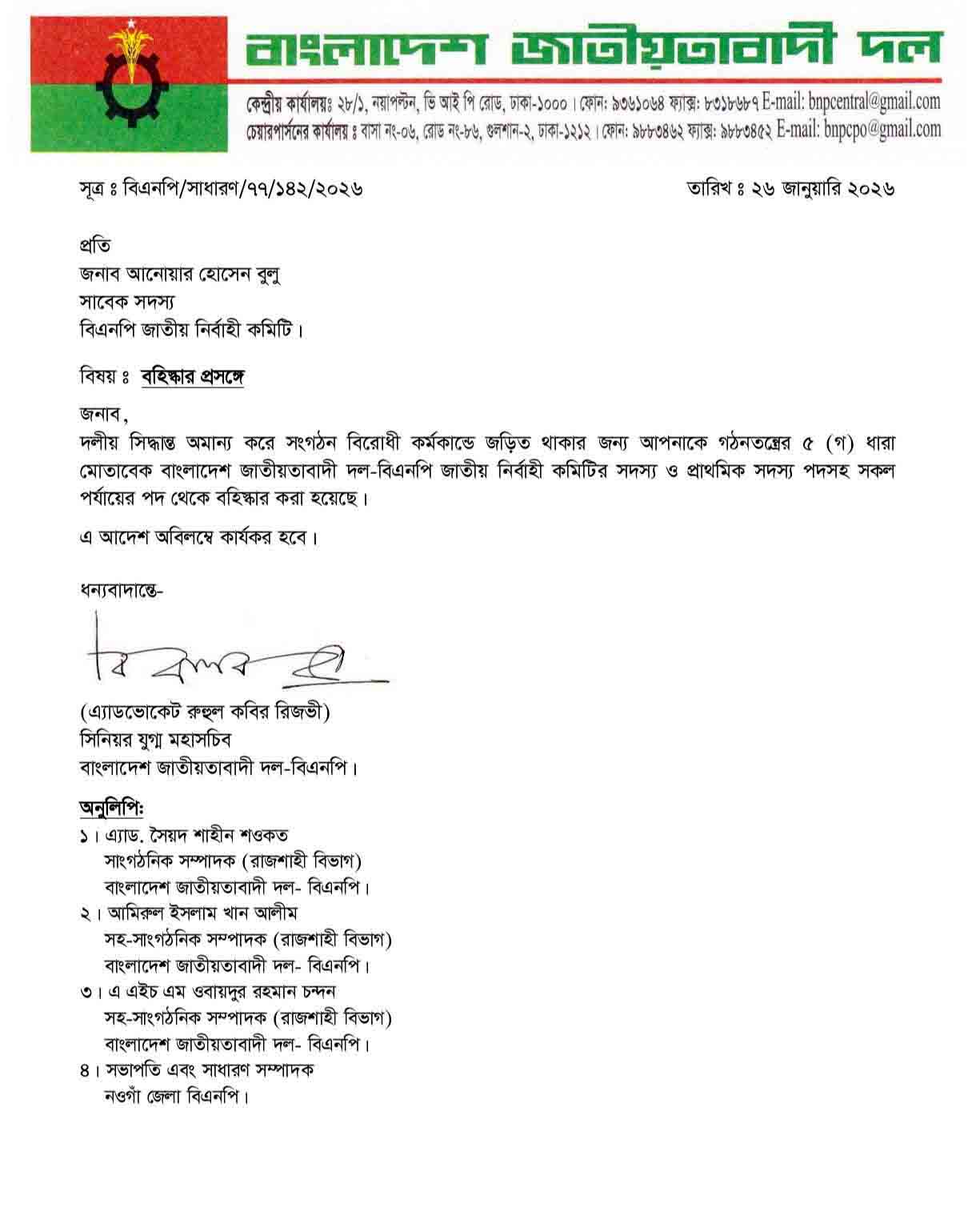 সংগঠন বিরোধী কর্মকান্ডে জড়িত থাকায় বিএনপির কেন্দ্রীয় নেতা আনোয়ার হোসেন বুলুকে বহিষ্কার
